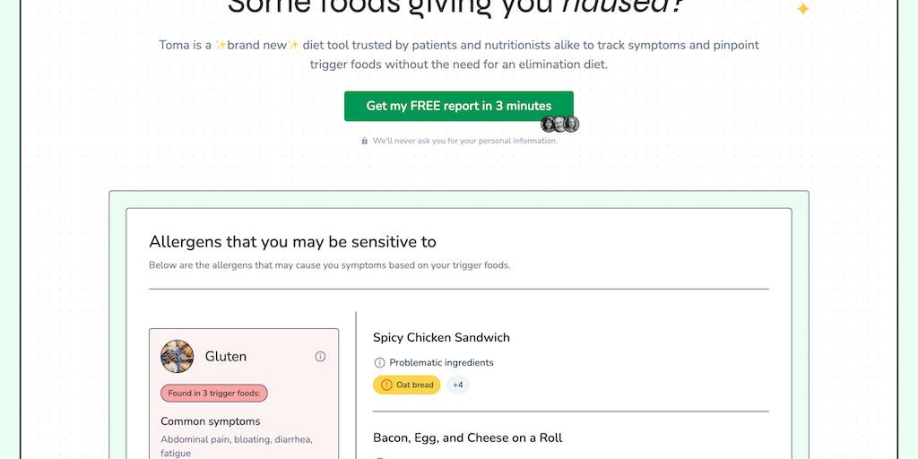 Toma is a ✨brand new✨ diet tool trusted by patients and nutritionists alike to track symptoms and pinpoint trigger foods without the need for an elimination diet. Currently, we let users perform elimi