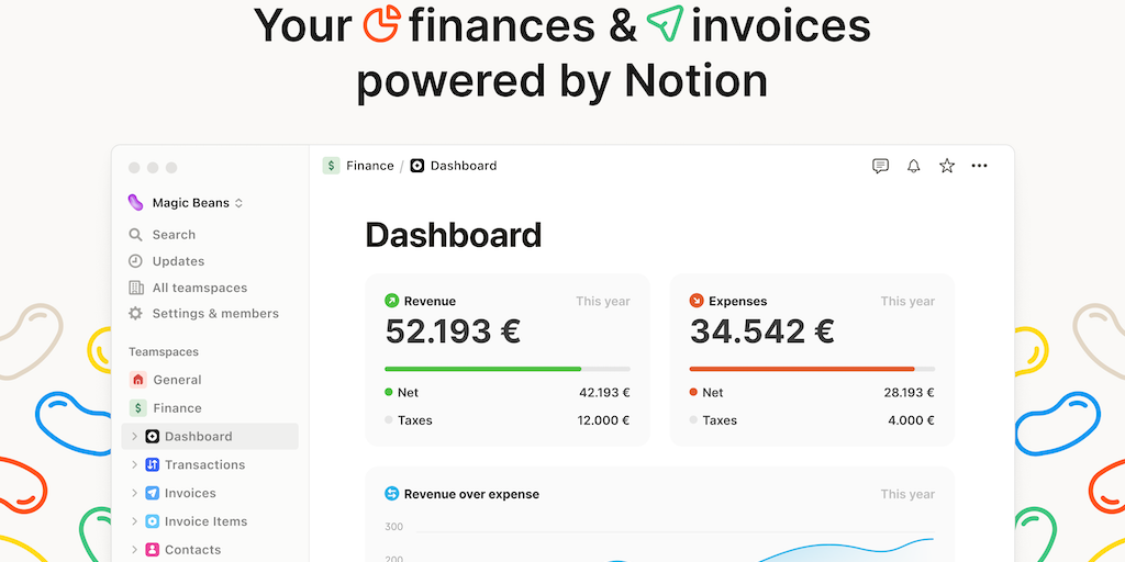 Magic Beans lets you run your business from Notion. Connect your bank account to get updated transactions and balances. View your finances in real-time with automated charts you can embed. Send profes