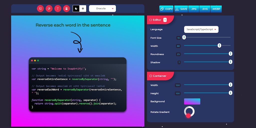 Transform any code snippets into stunning visuals that captivate your audience. Whether you're a developer showcasing your work or a tech enthusiast looking to add creativity to your code With a user-