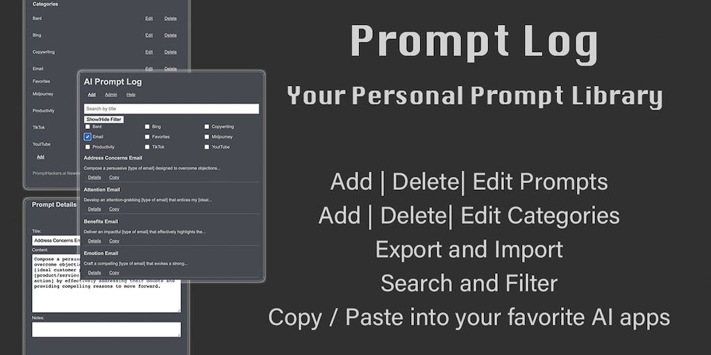 Build your own library of A.I. Prompts ★ Filterable, and Searchable list of your prompts. ★ Add, Edit, or delete your own Prompts or Categories. ★ Copy - Paste into Bard, Bing, ChatGPT, Midjourney, et