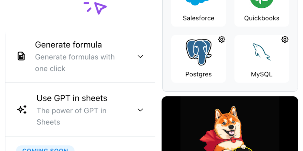 Magicdog supercharges Google Sheets with: - ✨ One click imports: effortlessly import data from Hubspot, Quickbooks and more. - 🤖 Automation: Automated alerts for email. - 🧰 AI Tools: Add AI into your