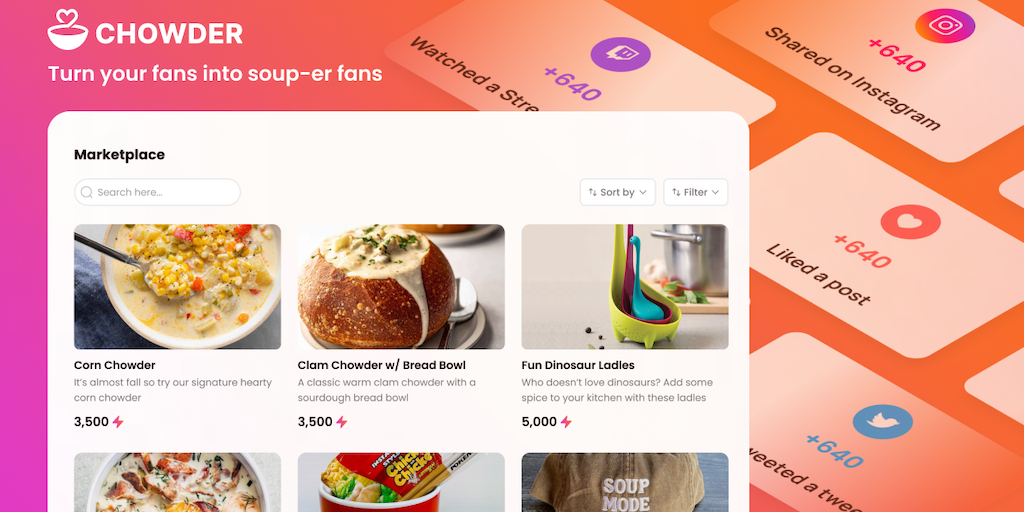 Chowder is a platform for brands to grow their social reach and build community loyalty by rewarding their audience for social engagement and other meaningful interactions.