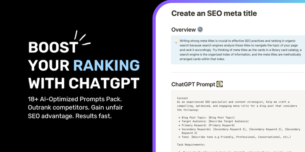 Skyrocket your traffic with ChatGPT. A hand-crafted collection of 18 SEO Mega-Prompts for Startups or Solopreneurs. Generate a keyword list, improve your content structure, and create better content i