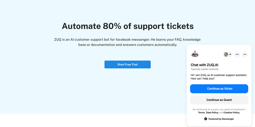 ZUQ.AI for Facebook Messenger - Create your own AI customer support agent, no code required | Product Hunt