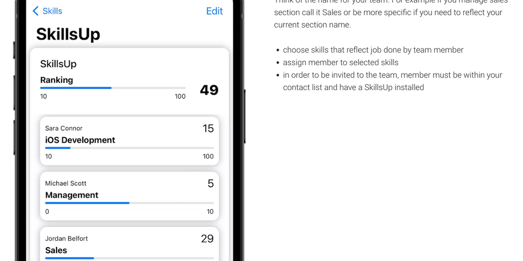 Assemble and manage teams without need for micromanagement. Pick skills and rate responsible person for them. Progress is visible to all team members. A grate motivator to perform. Skills gained, stay