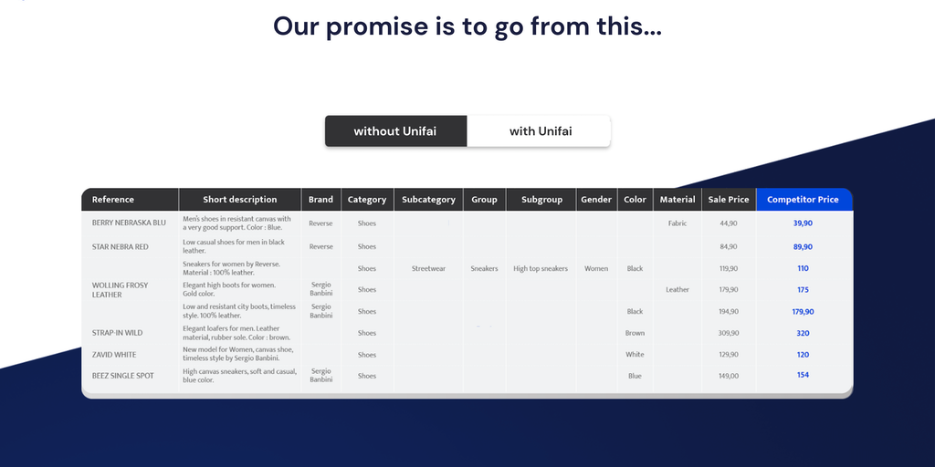 First AI platform that normalize, categorize & enrich product data automatically for e-tailers and distributors. Use Unifai to accelerate the onboarding of suppliers' catalogs, divide your time-to-mar