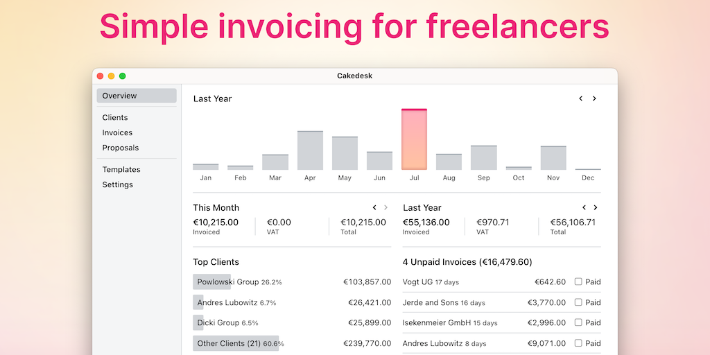 Cakedesk is a simple and fast invoicing app for Windows and macOS that lets freelancers and small businesses create invoices, proposals and manage their clients.