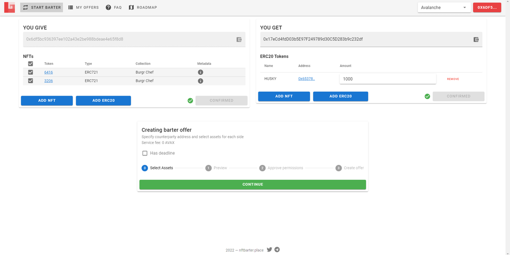 NFT p2p barter platform. Swap ERC721/ERC20 directly to other ERC721/ERC20 tokens. Avalanche, Binance Smart Chain, Polygon, Testnets.