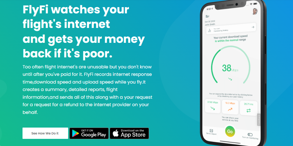 Inflight Wi-Fi connections are frequently unreliable, and you don't always get what you pay for. While onboard, FlyFi tracks internet response time, download and upload speeds. It submits a refund req