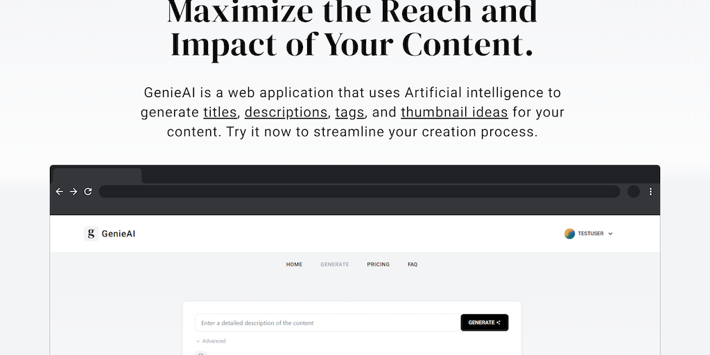 GenieAI is a web application that uses Artificial Intelligence (AI) to generate titles, descriptions, tags, and thumbnail ideas for your content. With GenieAI, creating metadata for your website or so