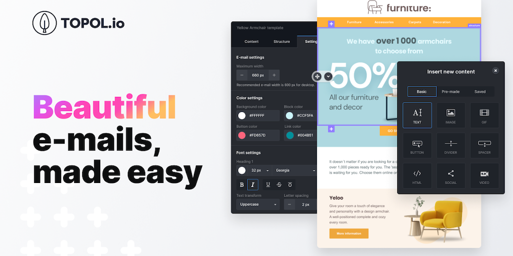 TOPOL.io email template builder is made to create beautiful email templates easily. Emails are responsive and ready in just a few minutes. We offer over 150 pre-made templates. And no need for coding.