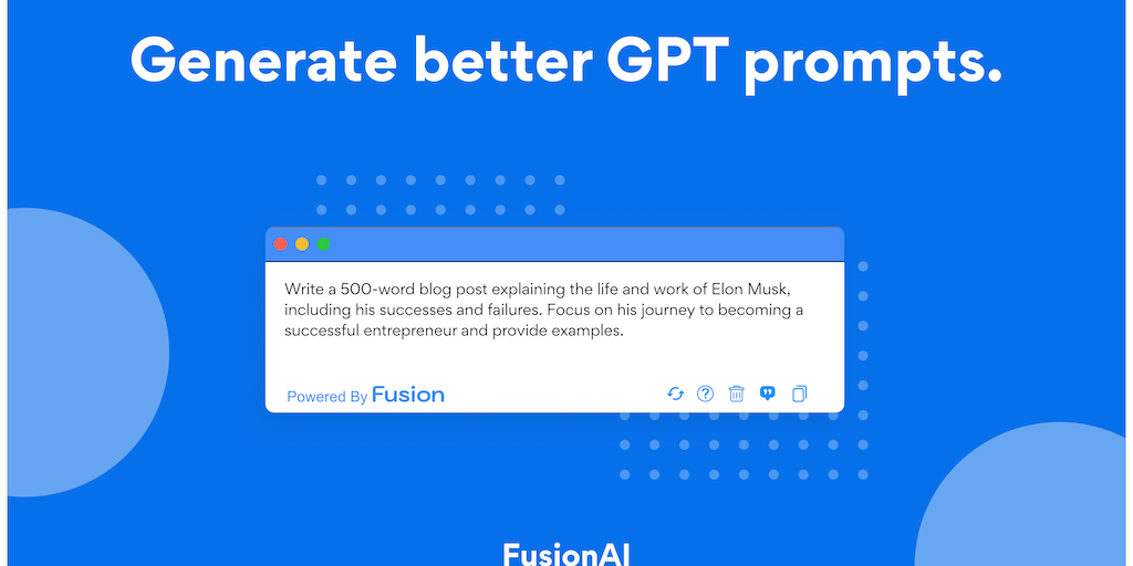 🚀 Introducing Fusion, the AI-powered prompt-engineering software that renders enhanced GPT prompts. 🤖 Utilizing the power of Open AI's GPT technology, Fusion generates unique and creative prompts to h