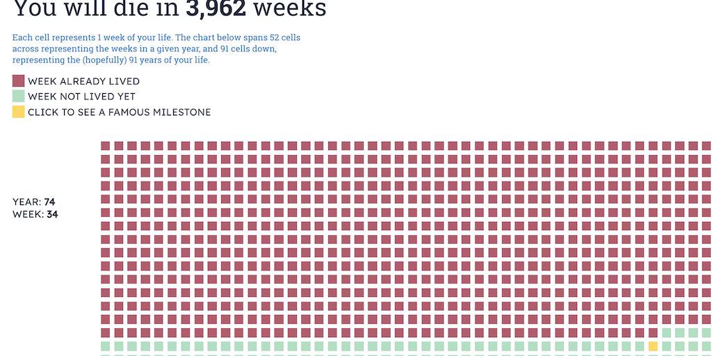 An interactive visualization of how many weeks you have to live. Realizing that there is a finite, countable number of weeks you have to live is a great way to stop procrastinating! Now with a gratitu
