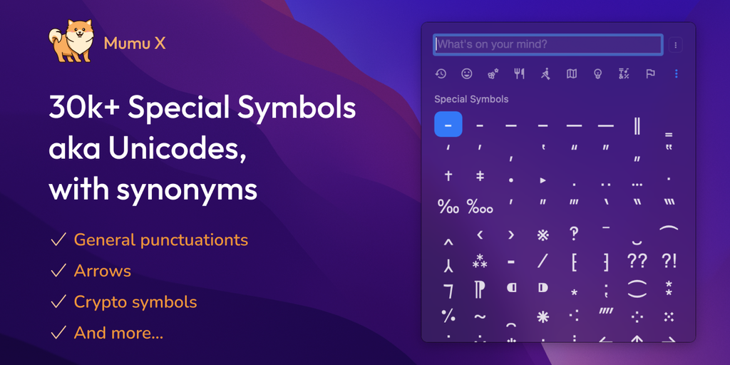 Special Symbols by Mumu X - 30k+ unicodes and their synonyms to speed up symbols picking | Product Hunt