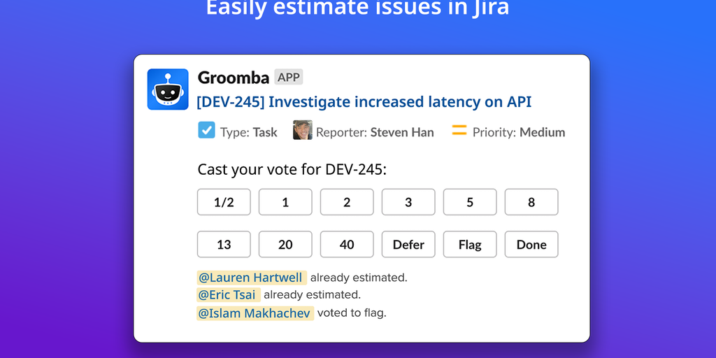 Groomba helps you estimate agile stories from your Jira backlog without leaving Slack. Your polling results are automatically synced with Jira. Asynchronous voting means you won't have to interrupt yo
