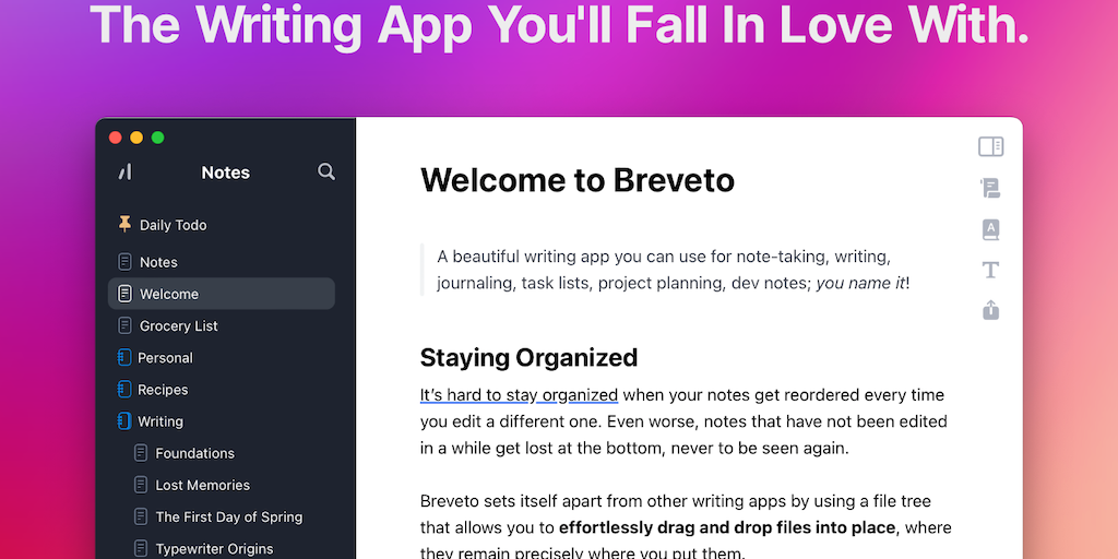 Breveto is a beautiful writing app for Mac with an elegant writing experience.