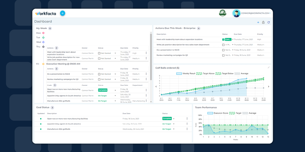 Executing a plan fails 90% of the time. Workfacta fixes this problem. Turn plans into results without the chaos! Our full business management suite lets you set SMART Goals, KPIs, OKRs, execute, track