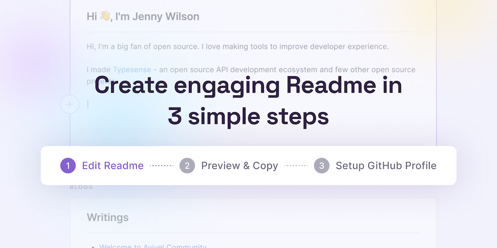 Aviyel GitHub profile Readme generator—a readme profile builder, designed to showcase contributors' work—provides a simple way for developers to highlight their code and non-code contributions.