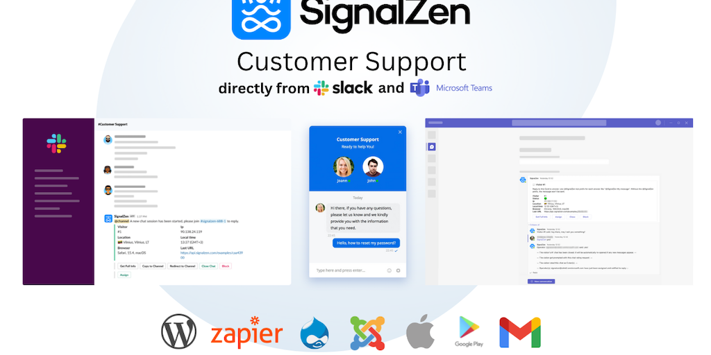Customer Support directly from Slack or Microsoft Teams. Add our Live Chat widget to your website and integrate your CS email box with SignalZen. Once it is done, you can talk to your website visitors
