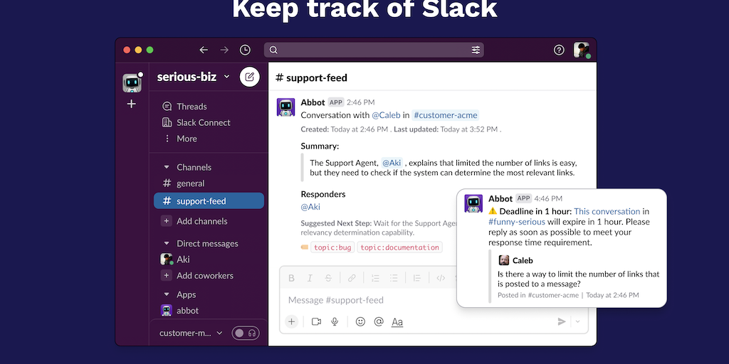 Abbot is a Slack app that helps your team stay on top of customer conversations in Slack.