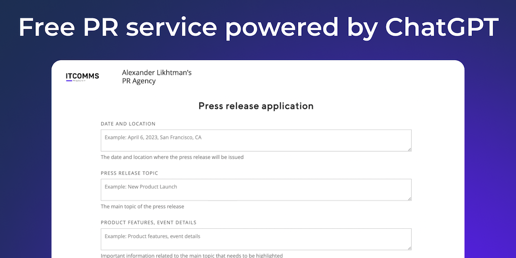 It's a free press release generator based on ChatGPT. With it, you can create the perfect press release in just a few minutes or even less!