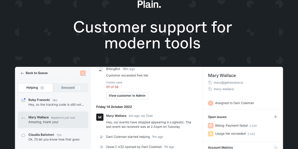 Plain is a customer support platform for modern tools. Let users reach you from anywhere in your product, in any format. View product interactions and messages in a single timeline, and get real-time