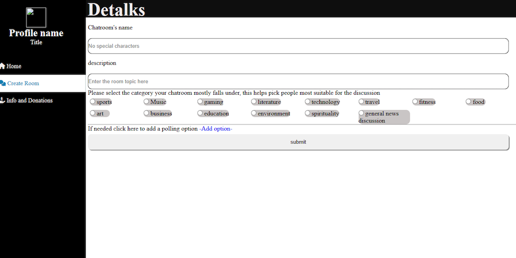 Detalks is a messaging website that lets users create a chat room with their own topic and the website picks 15 random users to join the chat room and discuss the topic with you. After 24 hours the we