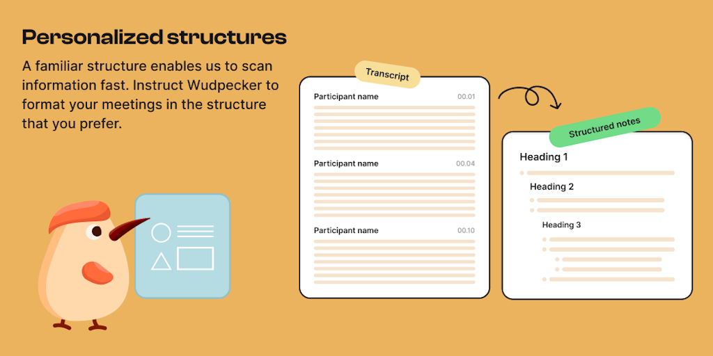 The first AI meeting assistant that tailors all notes for you. Instruct Wudpecker in any language. Capture specific details YOU care about. Create notes in a structure YOU like (templates, tables..).