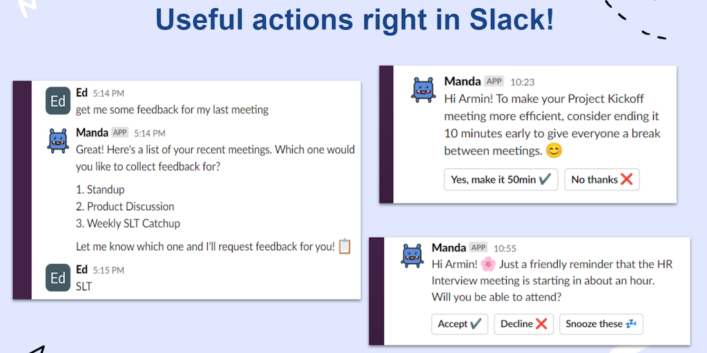 Project Manda improves productivity across your whole business with easy to understand insights and action items. - Game changing insights - AI meeting assistant - Review recurring meetings - Get feed