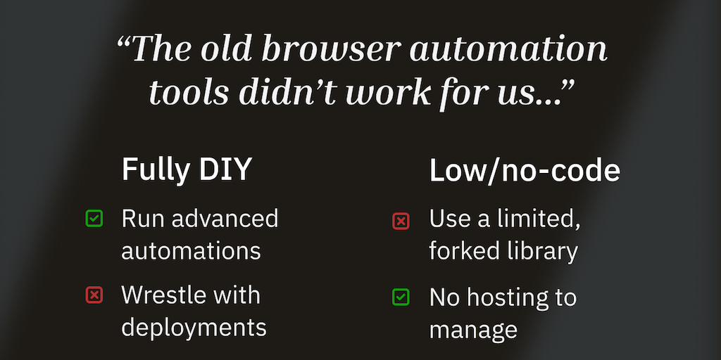 Write and run complex browser automations with Puppeteer or Playwright, without the hosting headaches. With v2.0, we now host headless Chrome, Firefox and Webkit. Plus, there are new extra features su