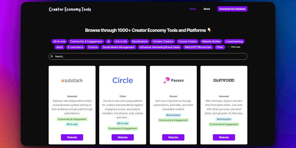 A curated directory to help you navigate the Creator Economy and find awesome tools! Browse through 1000+ startups, (AI) tools, platforms, and apps. Includes a free downloadable database, saving you h