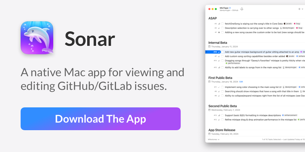 Sonar is a native Mac app that offers a fast & lightweight alternative to managing tasks from the GitHub or GitLab web UI. Sonar can do nearly everything the GitHub or GitLab issues web UI can do, but