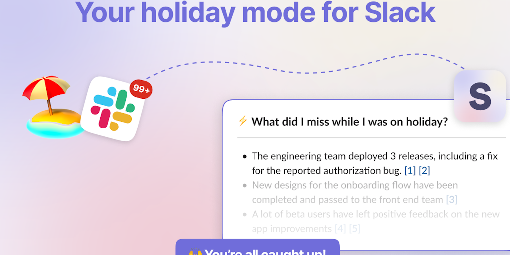 Take the stress out of your first day back with the holiday mode for Slack 🌴🏖️ Select the dates that you were away for, get a summary of what you’ve missed and ask questions about about the specifics!