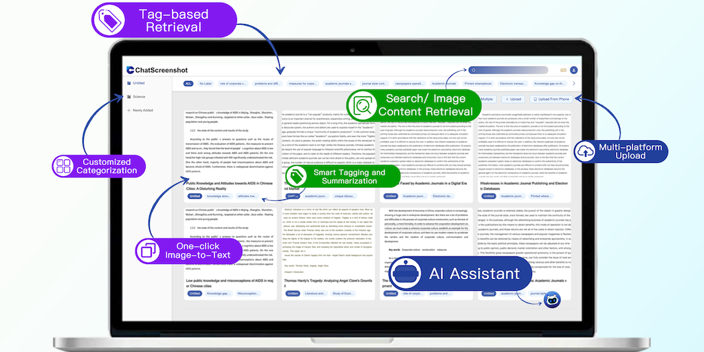 1) Chat with your photo album. 2) Get instant answers with images, photos and screenshots. 3) Dive into photos like never before with Chatscreenshot. 4) Let AI summarize long documents, explain comple