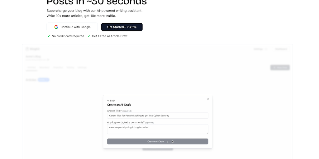 Blogkit's AI Writer generates high-quality and well-structured blog posts in ~30 seconds. Just give it an article title and an optional list of keywords/topics to cover, and it will do the heavy lifti