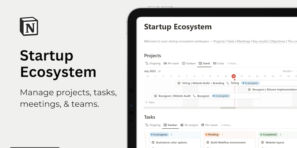 Notion Startup Ecosystem helps you keep track of all your business's moving parts. Manage projects, tasks, meetings, goals & more in an all-in-one dashboard.