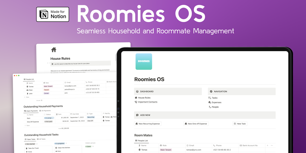 Introducing Roomies OS, the ultimate Notion template for seamless household and roommate management - track and manage household tasks, payments, people, announcements and more to bring clarity to you