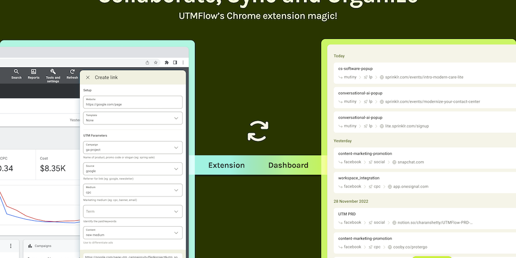 UTMFlow is a free UTM link builder for marketers. Easily create/manage UTM links via Chrome Extension with auto-fill UTM fields. Analyze results in tools like Google Analytics, Mixpanel, Kissmetrics,