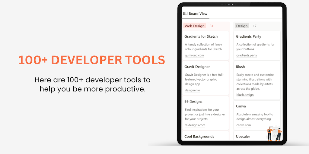 We have created this list of 100+ developer tools to make your work more productive and easier. What you will get: ✔️ Search, sort, and filter across resources ✔️ 100+ Developer tools ✔️ Increase your