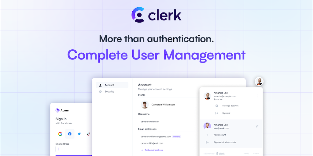 Clerk is more than a “sign-in box”. Integrate complete user management UIs and APIs, purpose-built for React, Next.js, and the Modern Web.