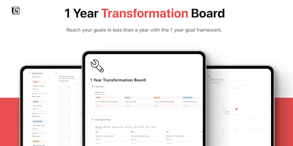 A dashboard designed to help you break down and achieve your goals in just one year, right within Notion. No need to overcomplicate things anymore.