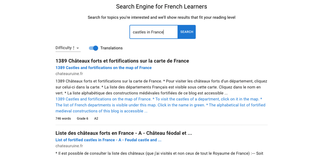 Learn French through targeted reading material! Search for whatever topics you're interested and we'll find you content from the web that suits your level.