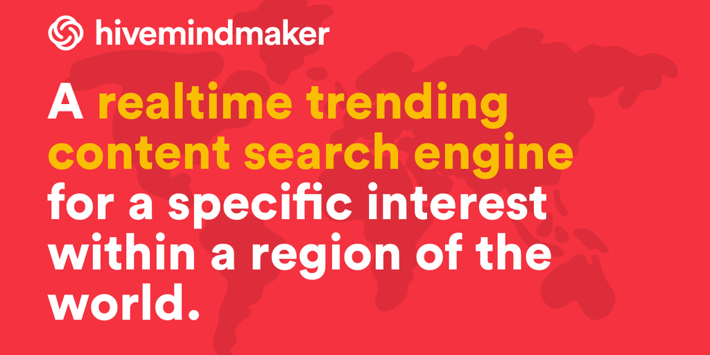 Introducing Hivemindmaker, a realtime trending content search engine for a specific interest within a region of the world. See what's trending, updated in realtime, only the most engaging content that