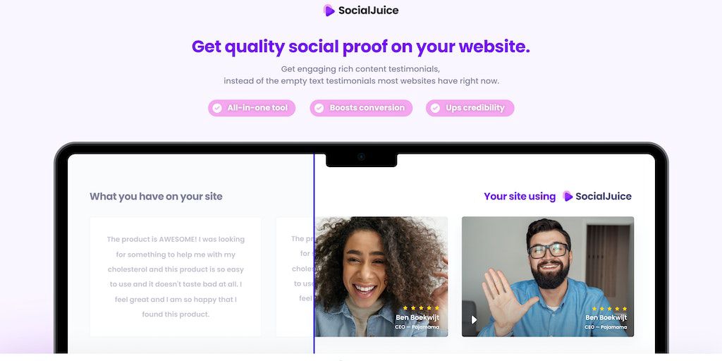 SocialJuice is a simple tool to collect video testimonials or textual testimonials from your clients. Share them on social media or embed them on your website using no-code. Add social proof to your s