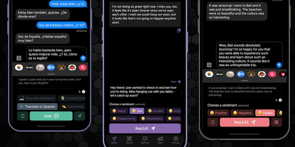Introducing ReplAI, your ultimate messaging companion for iOS! Generate personalized replies, proofread messages, and ask the AI anything you want. Includes a custom keyboard, iMessage and Siri Shortc
