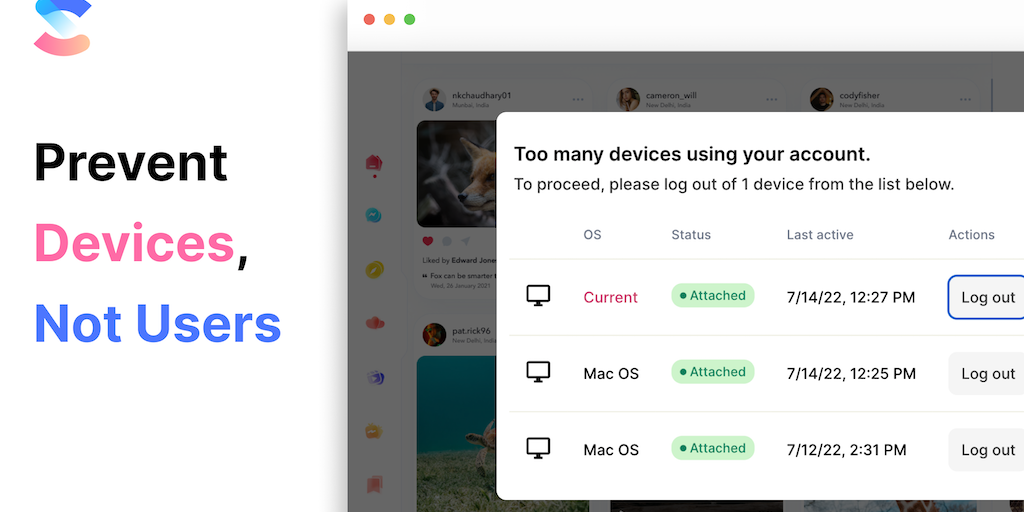 Sabil helps you monitor & control account sharing with the highest accuracy, least effort, and without losing users. It keeps track of the user devices; if they exceed the limit, it prompts them to lo