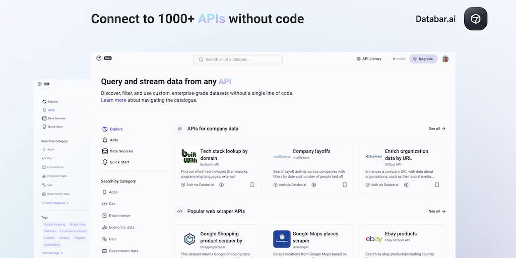 Databar lets you access any data API in under 3 clicks! ⚡ Enrich your data with 1000+ external data sources ⏱ Schedule enrichments to run on click or automatically 🏎️ Fast and easy: from connector to