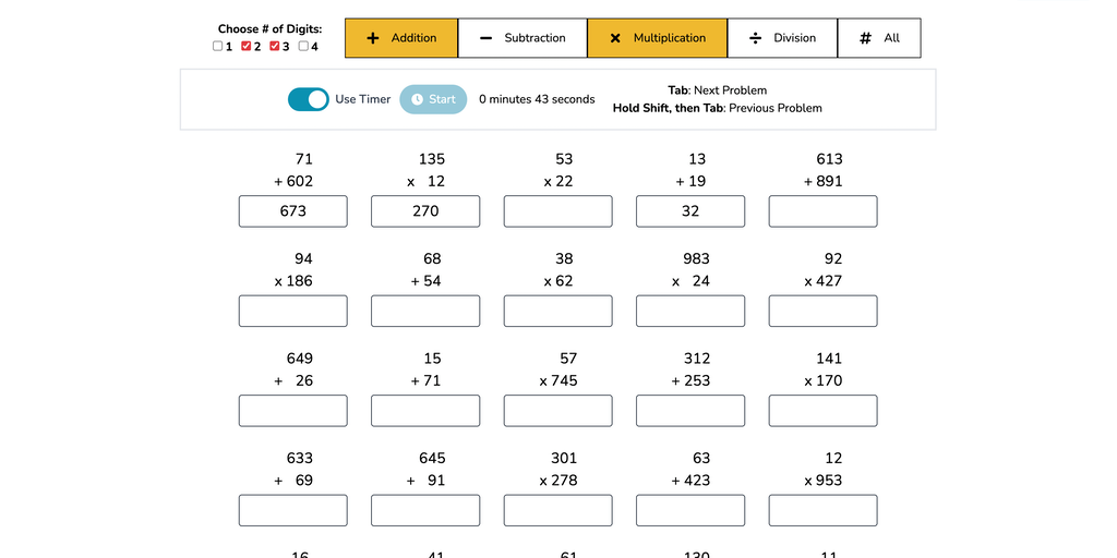 RoboMath is a platform for learning and practicing math online via worksheets and flashcards. Put your skills to a test and see how many problems you can do correctly in 1 minute!