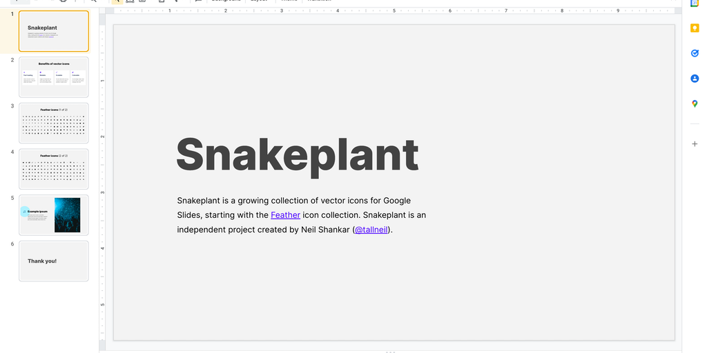 Snakeplant is a growing collection of vector icons for Google Slides, starting with the Feather icon collection. Snakeplant is an independent project created by Neil Shankar (@tallneil).