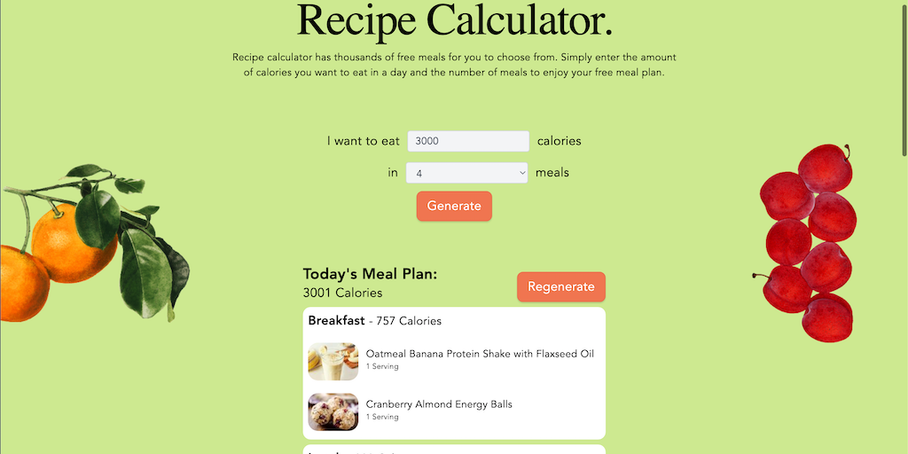 Recipes Calculator makes it easy to browse and save thousands of free recipes. Enter the desired calories and meals to generate a meal plan. There is no login or paid version. You can save any recipe
